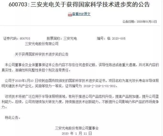 “公司于2020年1月10 日收到由國務院頒發的國家科學技術進步獎證書,項目名稱為高光效長壽命半導體照明關鍵技術與產業化,獎勵等級為一等獎,證書編號為 2019-J-219-1-01-D02。