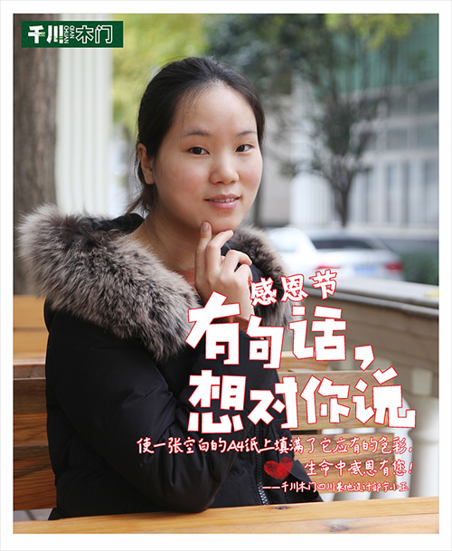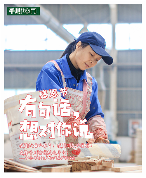 湖北生產基地門扇車間拼枋組阮海燕:人生天地,常懷一顆感恩的心!感謝父母的養育之恩!感謝朋友的理解和包容!感謝千川公司給我就業平臺, 讓我可以在自己的家鄉努力工作,好好生活。