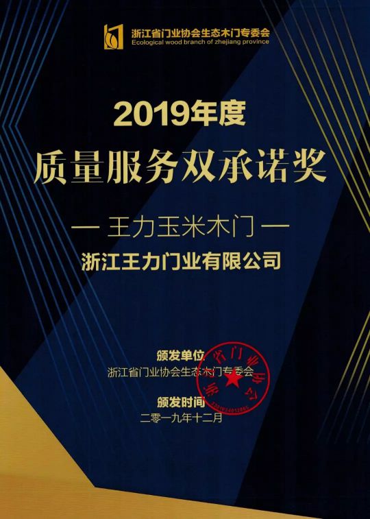 同時,王力玉米木門榮獲“2019年度質量服務雙承諾獎”,是社會各界和消費者對王力玉米木門品質和服務的充分肯定!王力玉米木門將緊跟國家大勢,繼續強化品牌意識,狠抓產品質量和售后服務水平,為消費者創造更加美好的家居生活。