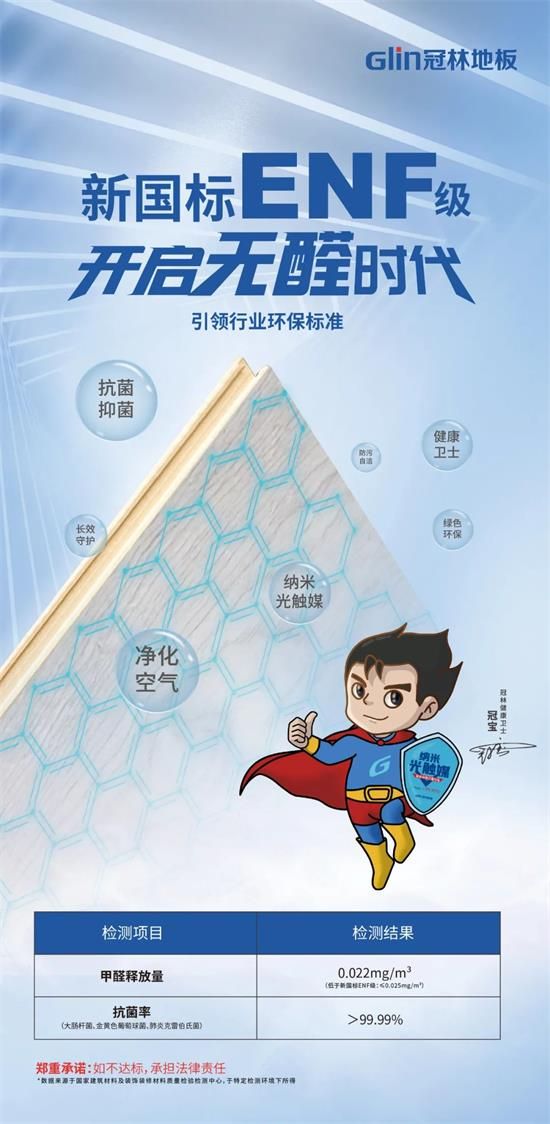 而冠林科技抗菌地板更是實現(xiàn)了從ENF級一大跨越式進步,保護更徹底。據(jù)悉,冠林地板采用特殊工藝在地板表層添加納米光觸媒,使地板具有分解空氣中因裝修或是建材揮發(fā)出來的甲醛、苯、TVOC等有毒有害氣體,并具有消除空氣中的異味臭味、抗菌消毒等功能,針對金黃色葡萄球菌、大腸桿菌、肺炎克雷伯氏菌抗菌率>99.99%。