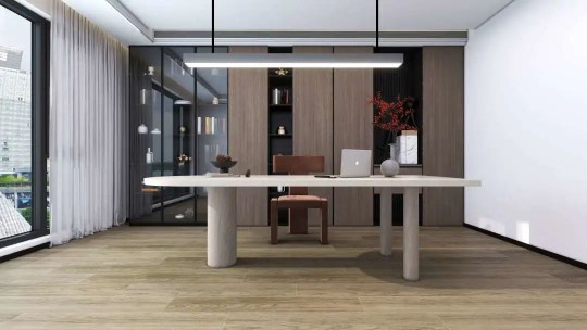 書房的布局錯落有致,蘊含著不對稱的美學。陽光灑在木地板上溫暖自然,觸感舒適生動,帶來大氣、內斂、高貴的視覺感受。