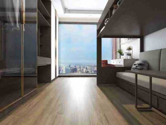 書桌連接衣柜,增加了空間連貫性,視覺上更加開闊。舍棄多余裝飾大面落地窗把自然美景引入室內,享受閑暇時光~