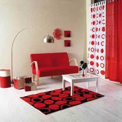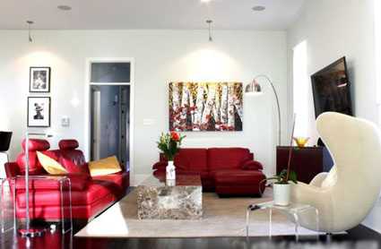 整面墻的白色電視機柜搭配淺棕色的木地板,建立空間的純凈感,鮮紅色的沙發則提亮了空間基調,以鮮明的色彩強烈的充斥著人們的視覺。陳列柜中的裝飾藝術品提升著空間的情趣感。