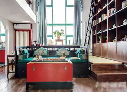 這款客廳風格奇特有趣,設計師大膽地將田園的清新亮色運用到了現代中式裝修中,讓一向給人沉穩莊重的中式風格變得時尚活潑。亮紅色的油漆包裹了木質茶幾,復古的綠色坐墊整齊擺在木沙發上,而且地面鋪上了清澈紋理的木地板,從色彩上就能感受到這個空間的別具一格。鮮亮的紅色就像早晨時分的朝霞,一切都是新的。
