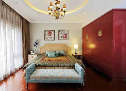 明亮的自然光從落地大窗投射進來,映射在紅色手抓紋地板和中式古典風格的大衣柜上,營造出高貴而舒適的氛圍。在美式風格的基礎上,感受那種淡淡的,飄逸的,深入骨髓的東方氣息。