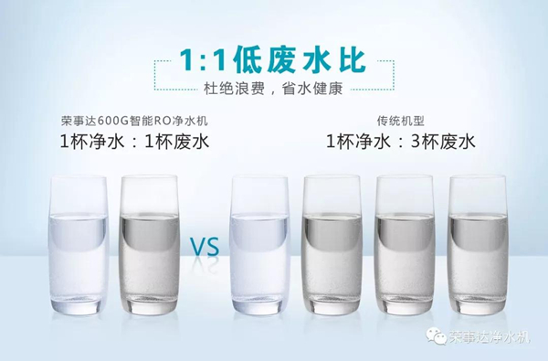 眾所周知,走心的產品總是以攻克消費痛點為目標。面對當前凈水市場主流的1:3廢水比難題,榮事達打破傳統廢水排放技術,通過科技創新,實現了1:1超低廢水比,600G智能反滲透凈水器出水效率由25%翻倍提升至50%,大大減少廢水排放,不僅節能環保,而且也節省了每一個家庭的生活開支。