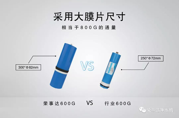 對于凈水器配件的選擇,榮事達一直是認真的。此次600G智能反滲透凈水器在核心部件RO反滲透膜的挑選上,就直接摒棄市場上主流的常規RO膜濾芯,采用專業定制化濾芯。 300Xφ82毫米獨特大膜片搭配專業卷膜技術,性能更為出眾,600G濾芯相當于800G濾芯通量,制水速度快,同時可充分凈化余氯、細菌、重金屬等有害物,出水可達直飲標準。