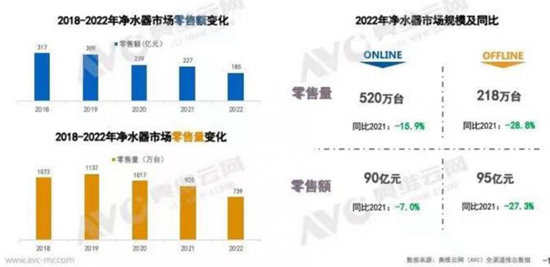 據奧維云網數據看,2022年國內凈水器零售總額為185億元,同比下降18.7%,零售數量739萬臺,同比下降20.2%,唯一可喜的是,銷售均價上從去年的2454元,上升至2503元,漲幅達到了2%,不過這2%相比前幾年,也下降明顯。