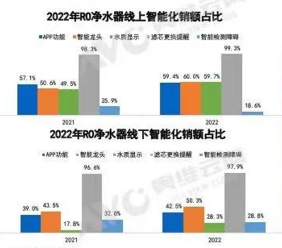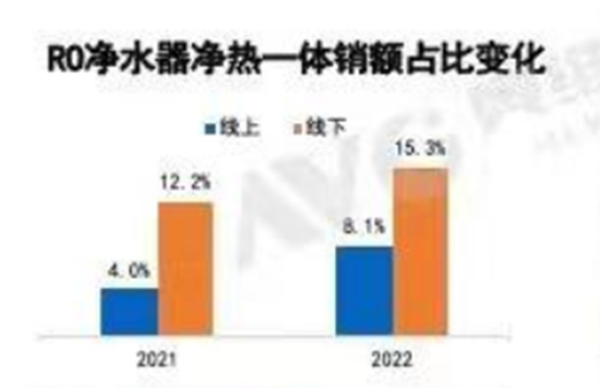 今年凈水器行業讓“多喝熱水”不再只是段子,奧維云網監測數據顯示,2022年線上RO凈熱一體機銷售額占比為8.1%,同比增長4.1%,線下占比為15.3%,同比增長3.1%。RO凈熱一體機銷售額的增加,反映出用戶從對凈水器的單一凈水需求,開始向多樣化用途的轉變。