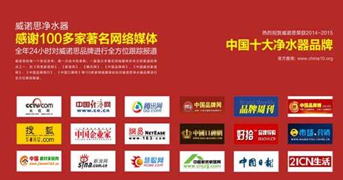 2015年,結果近6個多月的籌備、80多項的數據審核、各項產品品質的嚴格控制,近9萬多名網的熱心投票支持,威諾斯勇奪了“中國十大凈水器品牌”(官方查詢地址:中國品牌網:www.china10.org)、“中國著名凈水器品牌” 兩大榮譽稱號。并同時得到中央電視臺(央視網)、人民日報(人民網)、新華社(新華網)、新浪財經、騰訊家居、搜狐科技、鳳凰財經、中國品牌網、中國建材家居網、中國企業家品牌周刊等近100多家媒體聯合報道。