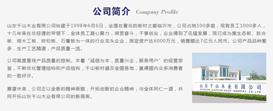 生態(tài)板十大品牌千山木業(yè),全稱山東千山木業(yè)有限公司,始建于1998年6月,是板材生產(chǎn)基地臨沂市的行業(yè)龍頭企業(yè),至今已有18年發(fā)展歷史。生態(tài)板十大品牌千山木業(yè)立志打造中國健康家具板品牌,創(chuàng)造科技前沿的高端環(huán)保產(chǎn)品,專注生產(chǎn)強韌、健康的優(yōu)質(zhì)板材,其生產(chǎn)實力、技術底蘊十分深厚。生態(tài)板十大品牌千山木業(yè)現(xiàn)今已開發(fā)出了以生態(tài)板升級產(chǎn)品《千山真木板》為代表的一系列真材實料、真正精工、嚴格遵循國家指標的產(chǎn)品。
