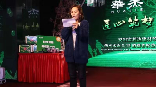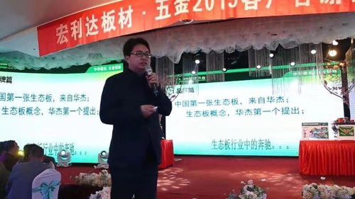 隨后,華杰木業區域經理王經理上臺致辭,感謝大家在百忙之中來到這里,華杰木業自1995年成立以來,一直致力于板材的生產與研發,尤其是在當前環保風暴下,環保設備及板材環保等級始終堅持在行業前段。以30年生的東北楊木為基材,配以植物大豆無醛膠,讓板材真正達到了E0級環保等級。