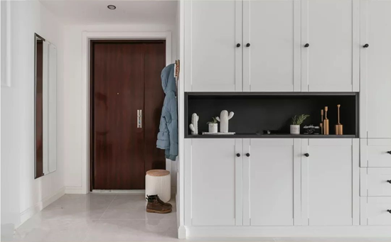 獨立式玄關又叫入戶花園,是入戶后的過渡區,可以設計成獨立儲物間,除了最基本的收納功能,還可以融入衣帽區、換鞋凳、置物區和全身鏡等功能,達到一柜多用的效果,讓入戶區域更顯別致大氣。