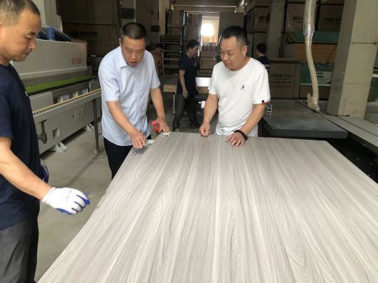 在新洲福漢銷售門店,鄧國斌現場查看了全新升級的杉木生態板新品,對產品外觀、紙張花色等情況進行細致查看,詳細詢問了產品的銷售情況。