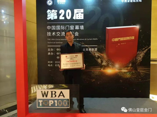 經過12年的發展壯大,皇庭金門的實力有目共睹,2018年10月30日,中國國際門窗幕墻技術交流研討會,中央藍海門窗幕墻發展聯盟,中國門窗品牌百強委員會給皇庭金門頒發《中國門窗百強》企業稱號!