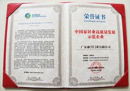 12月14日,在由全國(guó)工商聯(lián)家具裝飾業(yè)商會(huì)舉辦的2019中國(guó)門(mén)窗行業(yè)年會(huì)、中國(guó)門(mén)窗脊梁人物禮贊新中國(guó)70華誕暨《中國(guó)門(mén)窗業(yè)高質(zhì)量發(fā)展三年行動(dòng)計(jì)劃《(2020-2022)》發(fā)布會(huì)上,雍興集團(tuán)榮獲“中國(guó)家居業(yè)高質(zhì)量發(fā)展示范企業(yè)”稱(chēng)號(hào),集團(tuán)董事長(zhǎng)伍四兵先生榮獲“中國(guó)門(mén)窗脊梁人物”榮譽(yù)稱(chēng)號(hào)。