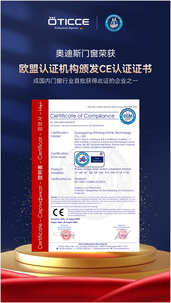 令人矚目的是,奧迪斯是首批獲得歐盟CE認(rèn)證的國內(nèi)門窗企業(yè)之一。在權(quán)威機(jī)構(gòu)的監(jiān)測之下,經(jīng)過安全、環(huán)保、衛(wèi)生等重重指標(biāo)測定,獲得了歐盟認(rèn)證機(jī)構(gòu)頒發(fā)的CE認(rèn)證證書,也就是取得了奧迪斯產(chǎn)品進(jìn)入歐洲的通行證。
