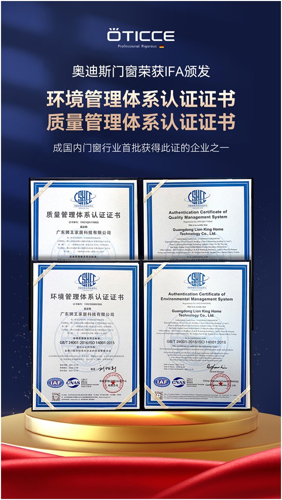 除此以外,奧迪斯門窗還歷經(jīng)多次科學(xué)、公正、嚴(yán)格的檢驗(yàn)、審查及復(fù)核評審環(huán)節(jié),榮獲權(quán)威IFA認(rèn)證機(jī)構(gòu)頒發(fā)的環(huán)境管理體系認(rèn)證證書和質(zhì)量管理體系認(rèn)證證書,證明奧迪斯門窗在質(zhì)量管理和環(huán)境管理上達(dá)到國際水平,不僅有利于國內(nèi)市場發(fā)展,更有助于向全球市場拓展,讓中國質(zhì)造走向世界。