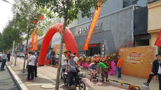 開業(yè)當日,新店盛況空前,現(xiàn)代范十足的外立面尤為引人注目,門前舞臺高筑,人頭攢動,擺滿了紅紅火火的禮炮和祝賀開業(yè)的花籃,可見人氣之高。