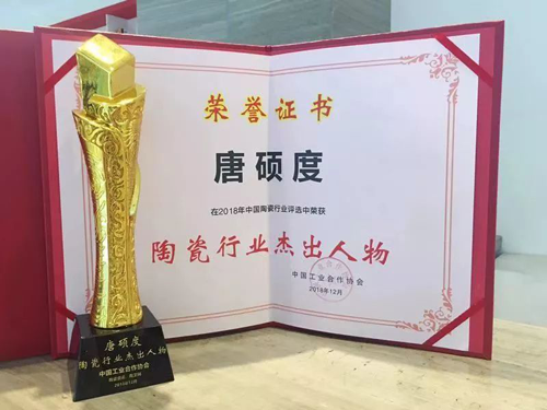 2018年12月18日下午,2018年表彰大會在廣東佛山舉行,廣西新高盛薄型建陶有限公司,LA’BOBO陶瓷薄板董事長唐碩度榮膺“陶瓷行業(yè)杰出人物”稱號。