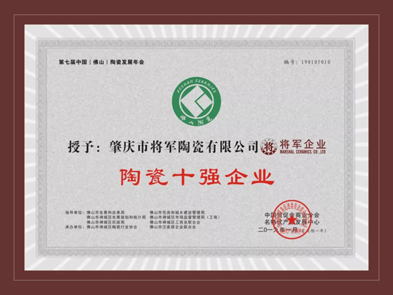 大將軍陶瓷自成立16年至今,一直本著著“品質是生命、文化是高度、創新是動力、服務是基礎”的企業理念,為廣大顧客構建充滿生活美的人居環境空間。本次榮耀的獲取,是企業多方位綜合實力的最強有力證明,也是社會各界對大將軍的肯定。