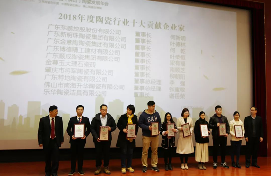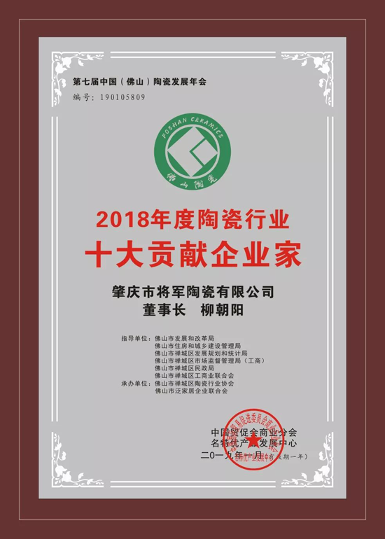 本次,大將軍陶瓷董事長柳朝陽先生榮獲“2018年度陶瓷行業十大貢獻企業家”,殊榮的背后,是對董事長柳朝陽先生很多年來著眼于促進陶瓷行業發展的貢獻和努力的高度肯定,同時也是對其企業運營管理的肯定,對其促進產品創新的表彰。