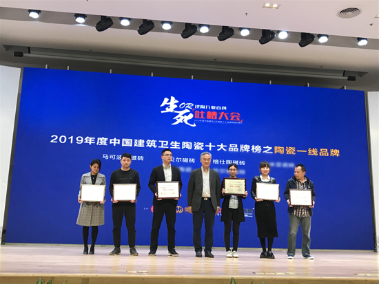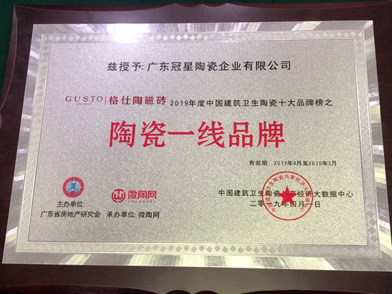 2019年4月1日,被建筑陶瓷行業譽為“百花獎”的中國建筑衛生陶瓷品牌名錄頒獎儀式在佛山中國陶瓷總部基地舉行。格仕陶磁磚憑借其強大的企業實力、良好的品牌聲譽和優異的市場表現,在眾多經營品牌中脫穎而出,一舉獲得“一線陶瓷品牌”的稱號。
