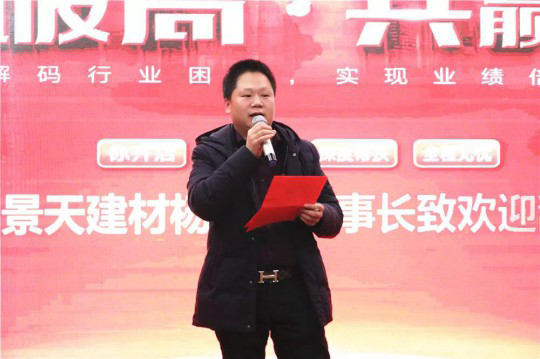 楊總首先代表景天建材全體同仁向遠道而來的各位經銷商朋友表示熱烈的歡迎,對大家的到來表示真心的感謝。楊總著重介紹了景天建材的發展歷史與雄厚的硬實力,并預祝本次招商大會圓滿成功,大家能攜手并進,共贏未來!