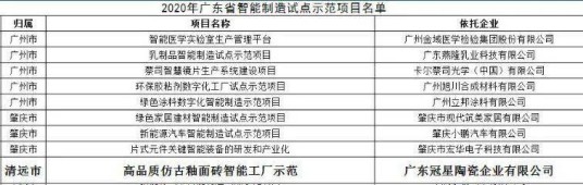 日前,廣東省工業和信息化廳發布:2020年廣東省智能制造試點示范項目名單,其中 廣東冠星陶瓷企業有限公司高品質仿古釉面磚智能工廠示范項目入選!