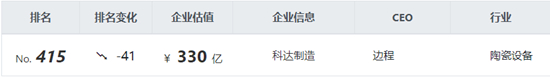 在陶瓷行業相關領域,科達制造、國瓷材料兩家企業上榜。其中,科達制造估值330億元,排名415位;國瓷材料估值305億元,排名451位。