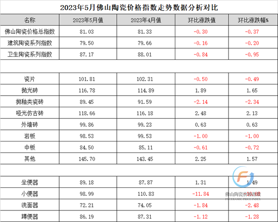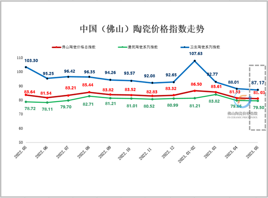 2023年5月份佛山陶瓷價格總指數(shù)報81.03點,環(huán)比跌0.30,環(huán)比跌幅0.37%。建筑陶瓷系列指數(shù)報79.50點,環(huán)比跌0.16,環(huán)比跌0.20%;衛(wèi)生陶瓷系列指數(shù)報87.17點,環(huán)比跌0.84,環(huán)比跌幅0.95%。5月三大類指數(shù)齊齊下跌,佛山陶瓷市場交易逆勢下行,多數(shù)代表品跌幅加大,市場行情整體下滑。