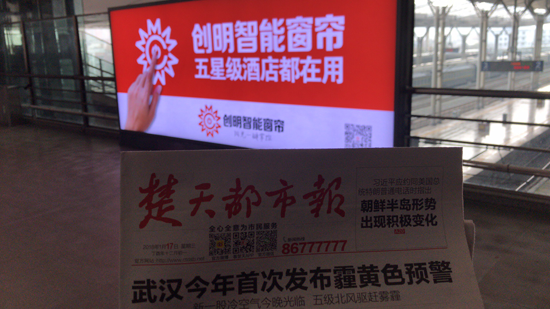 1月17日,知名窗簾品牌創(chuàng)明高鐵廣告在武昌站正式發(fā)布,由此,創(chuàng)明2018品牌推廣季正式拉開帷幕。2018年,創(chuàng)明與江蘇永達(dá)高鐵傳媒在高鐵廣告領(lǐng)域達(dá)成戰(zhàn)略合作協(xié)議。