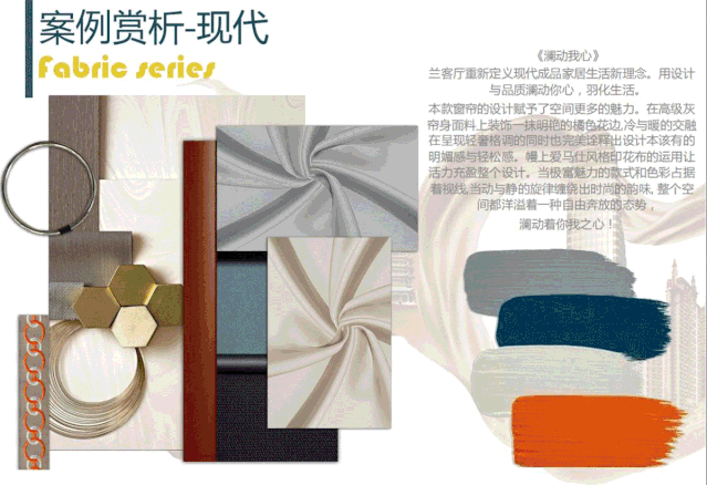 本款窗簾的設計賦予了空間更多的魅力。在高級灰簾身面料上裝飾一抹明艷的橘色花邊,冷與暖的交融在呈現輕奢格調的同時也完美詮釋出設計本該有的明媚感與輕松感。幔上愛馬仕風格繡花布的運用讓活力充盈整個設計。當極富魅力的款式和色彩占據著視線,當動與靜的旋律纏繞出時尚的韻味, 整個空間都洋溢著一種自由奔放的態勢,瀾動著你我之心!