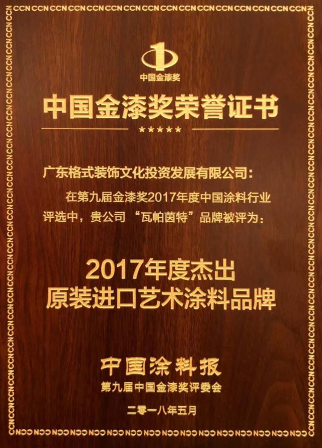 格式文化攜手100%意大利原裝進口藝術(shù)涂料瓦帕茵特一舉斬獲“第九屆金漆獎2017年度杰出原裝進口藝術(shù)涂料品牌”