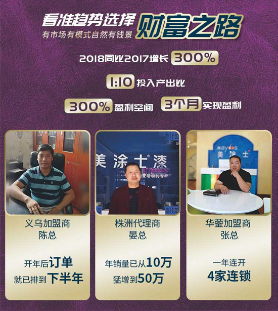 2018年,美涂士藝術涂料同比增長300%,每年增加200多家店鋪。其中,義烏加盟商陳總自開業以來已下訂單到下半年。株洲代理商晏總的年銷售額從2018年的10萬飆升至50萬。華菳加盟商張總在一年內開了四家連鎖店。財富的夢想正在一個接一個地實現。