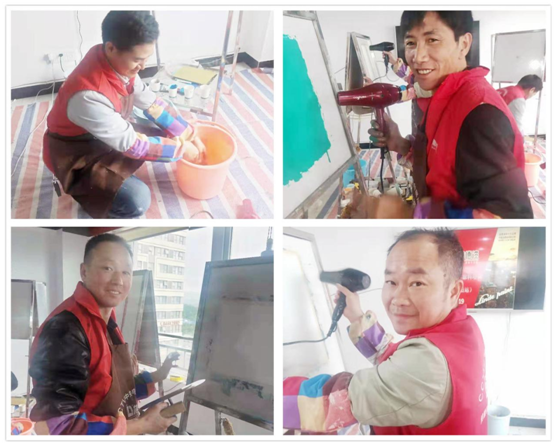 在學員們親自上陣的環節中,各位學員一絲不茍、認真操作,不遺漏每一個步驟、不放過每一個細節,精益求精、全情投入到練習當中。學員通過資深藝術涂料工程師的細心指導和自己大膽的嘗試,紛紛獨立完成了理想的藝術作品,掌握了藝術涂料的施工技能和色彩搭配等知識。