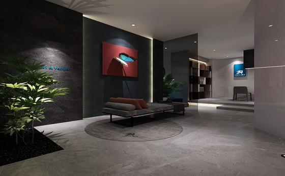 半圓或圓形的裝飾墻都巧妙運用中國流行的圓通柔和設計,經典的中國紅把高級灰冷色調瞬間撼動,仿佛太陽的血在云海和太空中漫開,映現出壯麗的血紅。使空間冷曖相宜,舒適而愜意,精致而高雅。