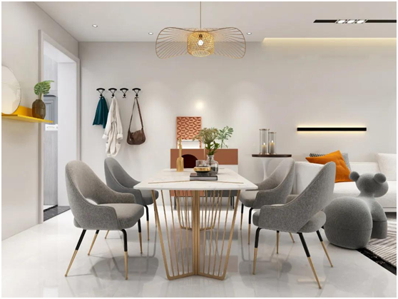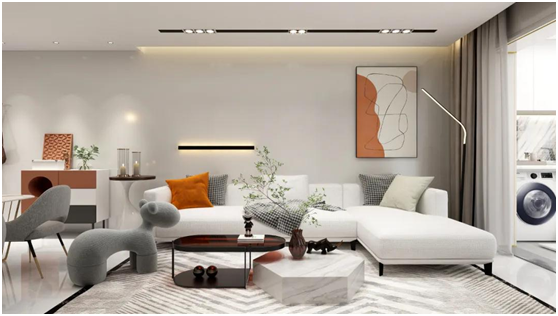 使用現代簡潔的線條表達出當代生活的高端品質與態度,布質沙發、大理石茶幾以及色調與家具完美契合的質感地毯,均以絕佳的材質,展現出對精致生活的追求。