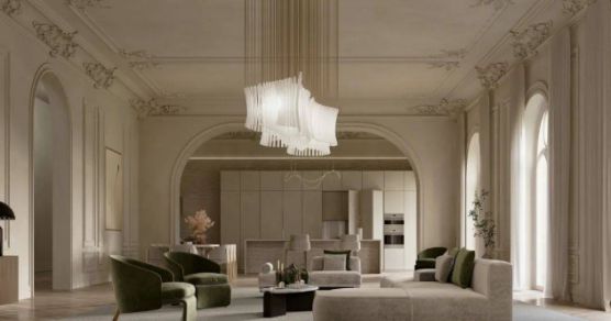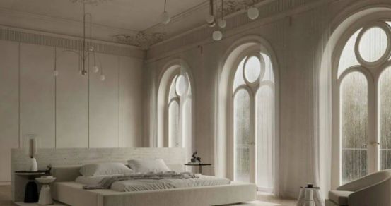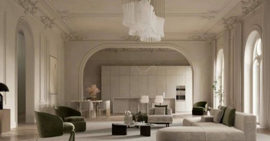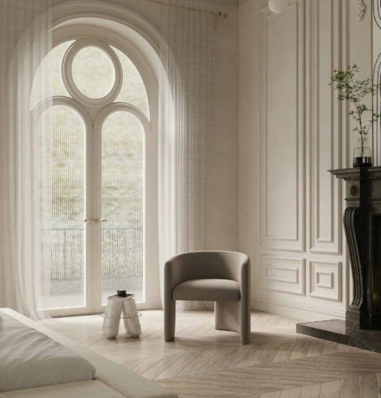 球形吊燈與拱形門窗互為呼應,為空間帶來幾何美感。由頂及面的奶油色系藝術漆,凸顯自然的溫柔與質感,營造知性、自由、浪漫的法式意境。