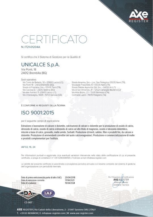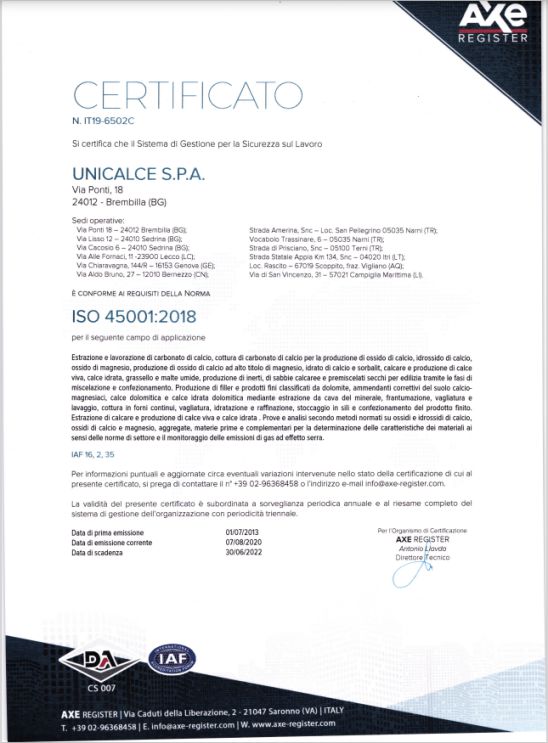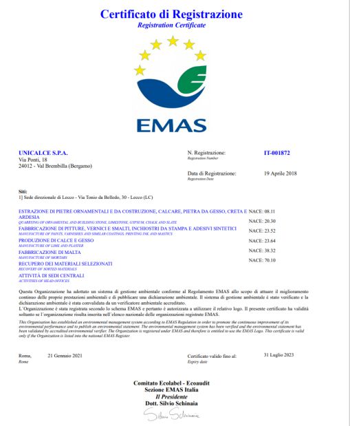 Unicalce多年前就已經(jīng)在數(shù)個(gè)工廠(chǎng)實(shí)施了環(huán)境管理系統(tǒng),并且均獲得了EMAS歐洲生態(tài)標(biāo)識(shí)認(rèn)證、ISO 9001:2015國(guó)際質(zhì)量管理體系認(rèn)證以及ISO 45001: 2018職業(yè)健康安全管理認(rèn)證。