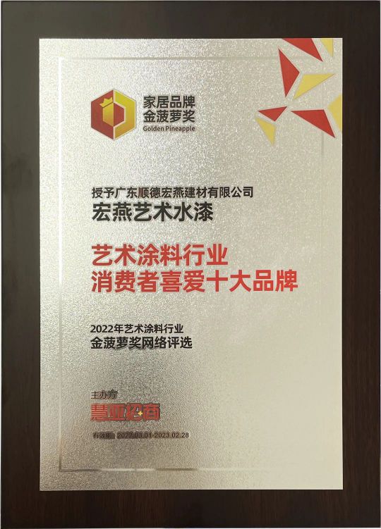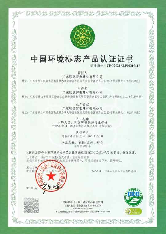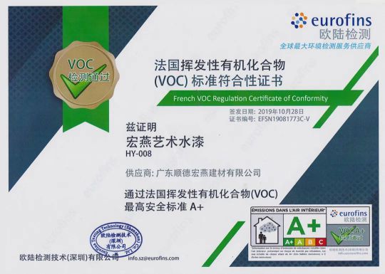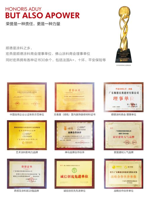 憑借出色產品品質,宏燕被評為“中國建筑裝飾裝修材料協會建筑涂料分會會員單位”,更屢獲“藝術涂料十大品牌”、“家居建材人氣品牌”等榮譽。此外,宏燕2019年10月28日通過法國揮發性有機化合物(VOC)最高安全標準A+認證,并于2021年2月4日通過中國環境標志產品認證(簡稱“十環認證”),目前藝術涂料行業只有立邦、三棵樹、嘉寶莉、巴德士、宏燕有十環認證。
