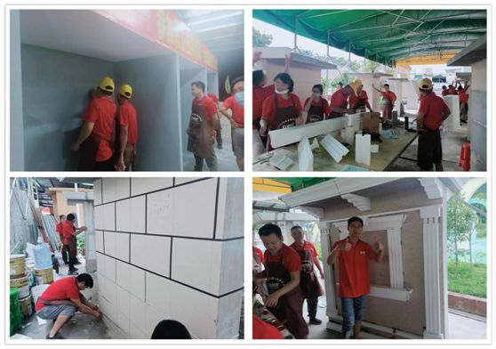 在培訓實操環(huán)節(jié),剛剛接受了理論培訓的學員們面對新產(chǎn)品、新工藝躍躍欲試,學員分小組,在老師的指導下,進行大面積上墻施工。