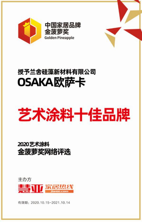 OSAKA歐薩卡藝術(shù)涂料作為進(jìn)口涂料代表品牌,成功斬獲“中國(guó)家居品牌金菠蘿獎(jiǎng)”、“藝術(shù)涂料十大品牌”、“十大推薦涂料品牌”等榮譽(yù),在中國(guó)家居品牌的舞臺(tái)上大放異彩,榮耀加冕!