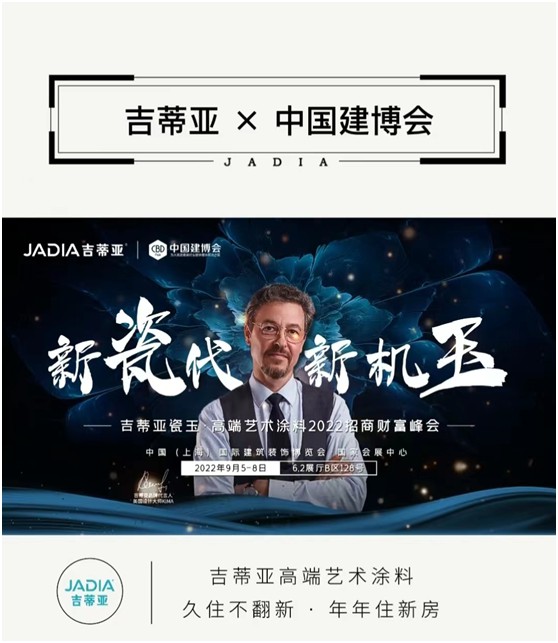2022年9月5至8日,中國建博會(上海),前來上海虹橋·國家會展中心,與吉蒂亞一同開啟墻面不翻新之旅,感受吉蒂亞瓷玉科技創(chuàng)新的力量!玉出色,愈出彩!吉蒂亞藝術(shù)涂料,在上海等你。