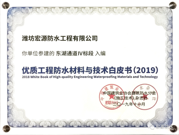 11月15日,中國建筑業(yè)協(xié)會建筑防水分會2019年會暨防水產(chǎn)業(yè)鏈發(fā)展論壇在上海召開。會上,發(fā)布了《優(yōu)質(zhì)工程防水材料與技術白皮書(2019版)》,宏源防水參建的“東湖通道IV標段“項目入編。
