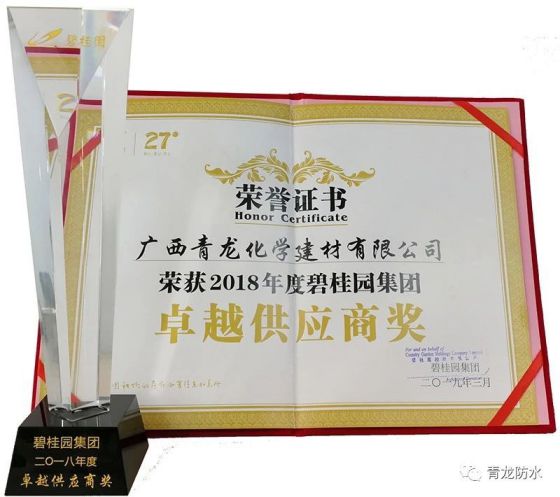 兩次榮獲碧桂園大獎,體現了青龍公司與碧桂園戰略合作的緊密,充分體現了碧桂園集團對青龍防水品質與服務的認可與肯定,完美展現了青龍公司22年的強大品牌實力。