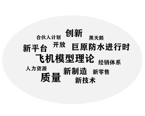 第2個就是我們企業(yè)的員工,為什么面向這兩個方面呢,公司的戰(zhàn)略部門去年一直在研究我們公司品牌的增長路線圖,總結(jié)出了一個“飛機模型”這是屬于巨原公司的戰(zhàn)略秘密,這里把它詳細說出來第一就是給行業(yè)人員的參考,第二就是讓更多人了解我們公司,對于經(jīng)銷商平臺和對于人力資源的政策,“開放”一直是我們的宗旨,只有這樣才會有更多深入的人了解我們和選擇我們。