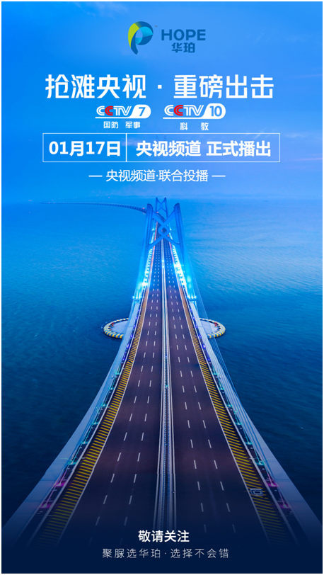 2022年1月17日起,華珀攜央視廣告片榮耀登場,在CCTV-7、CCTV-10上連續播映,向全國十余億觀眾展示全新的品牌形象,使品牌核心主張深入人心。一次成功的央視投播,凸顯出企業卓越的品牌力和自身的高度自信,更是一次軟實力的完美升華。