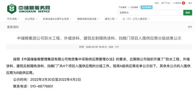 近日,中儲糧集團發布防水工程、外墻涂料、建筑反射隔熱涂料、擋糧門項目入圍供應商分級結果公示。其中,著名品牌濰坊宏源防水工程有限公司獲評防水工程A級供應商。