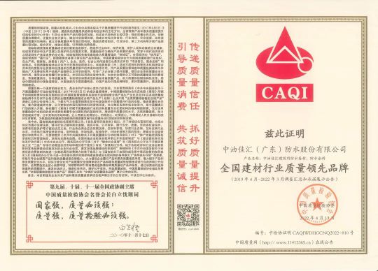 近日,中油佳匯通過層層權威評定榮獲中國質量檢驗協會(CAQI)頒發的“全國建材行業質量領先企業”與“全國建材行業質量領先品牌”兩項榮譽。